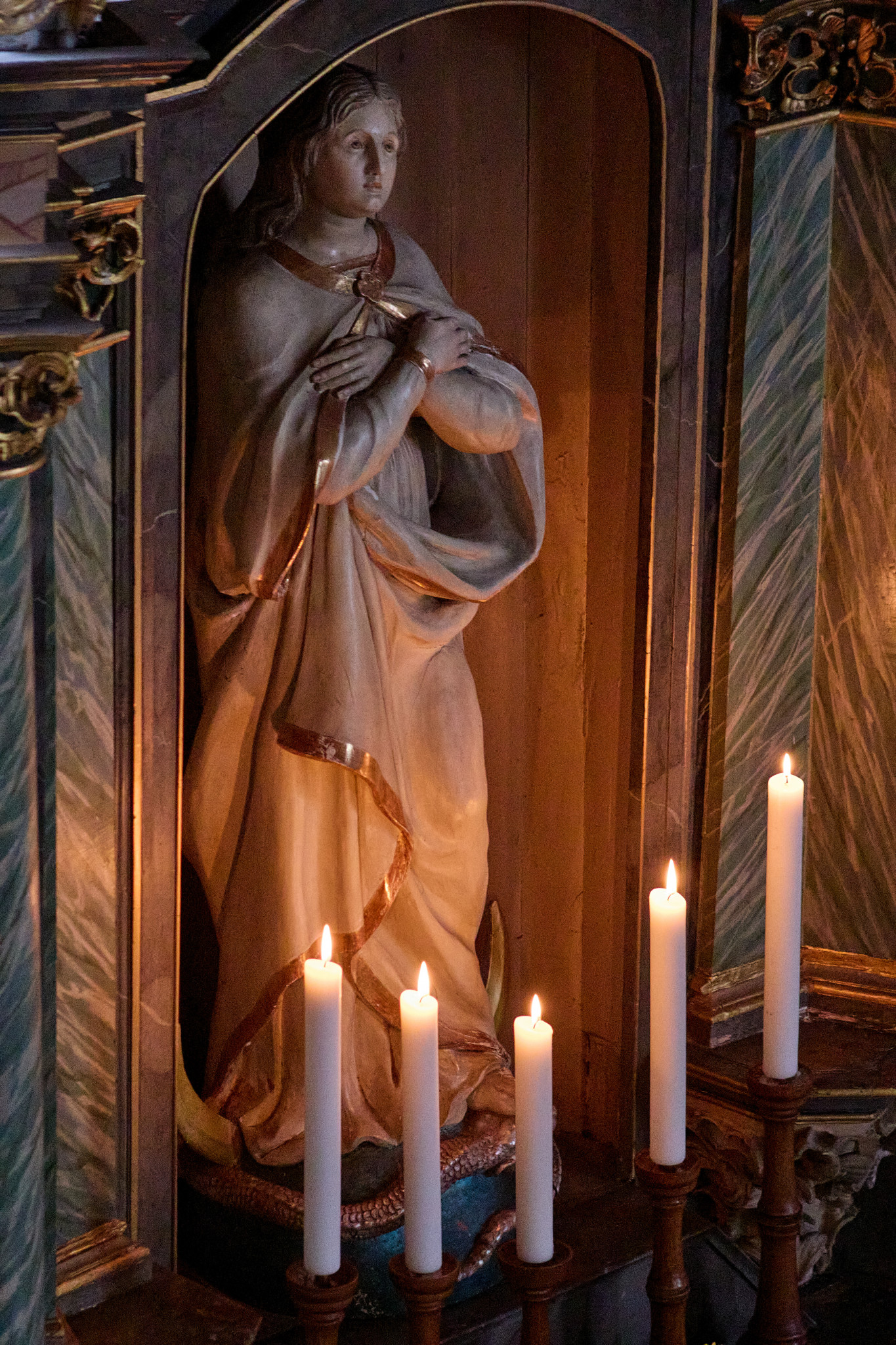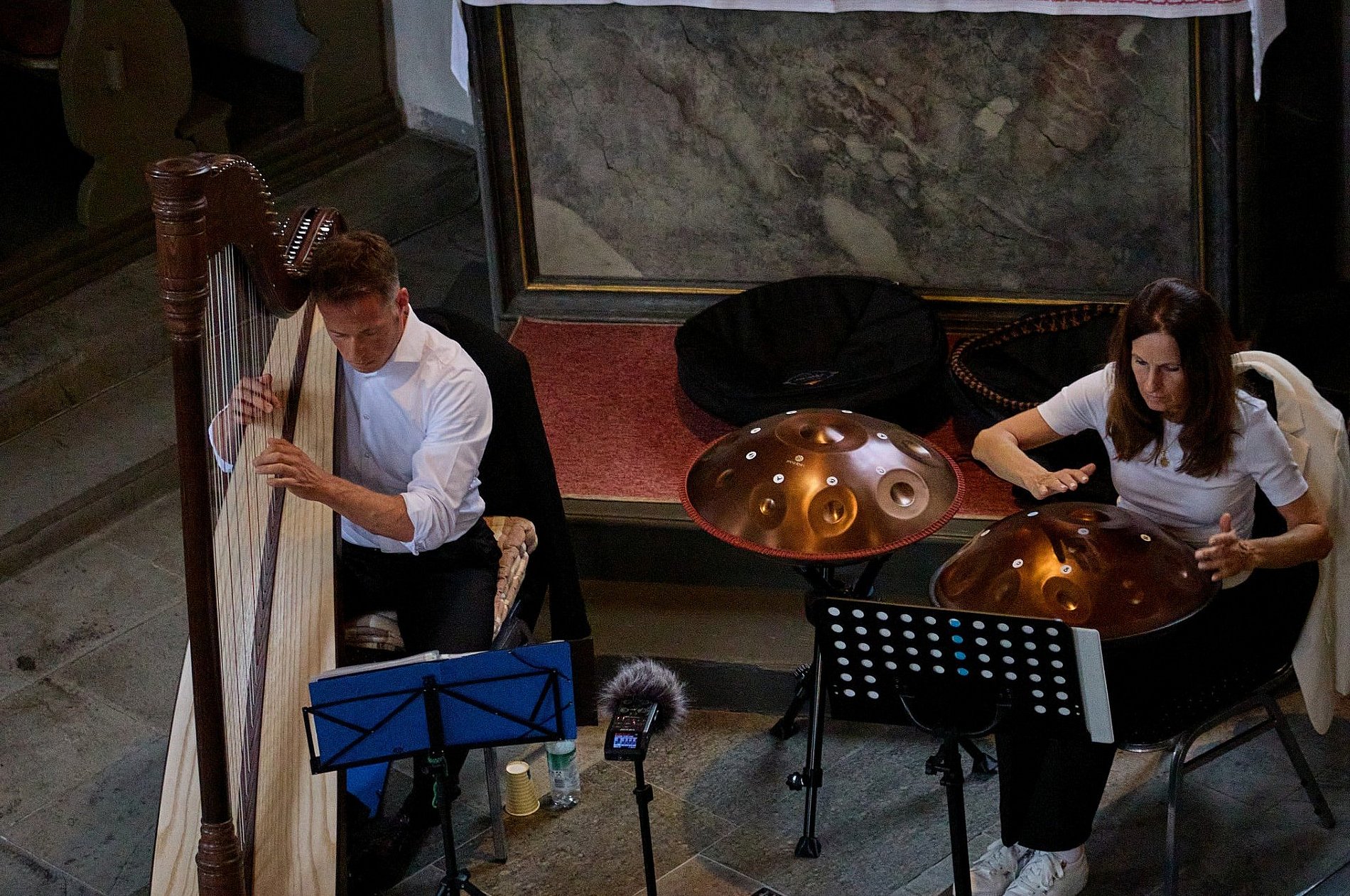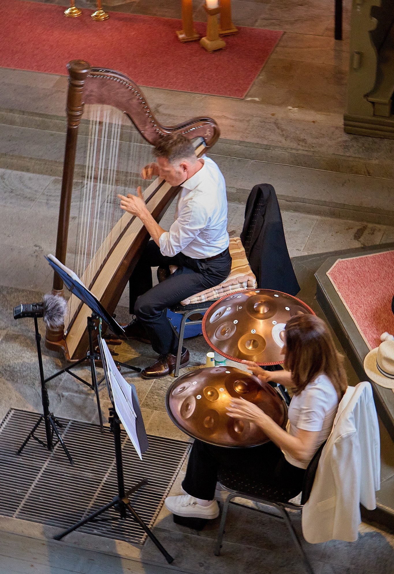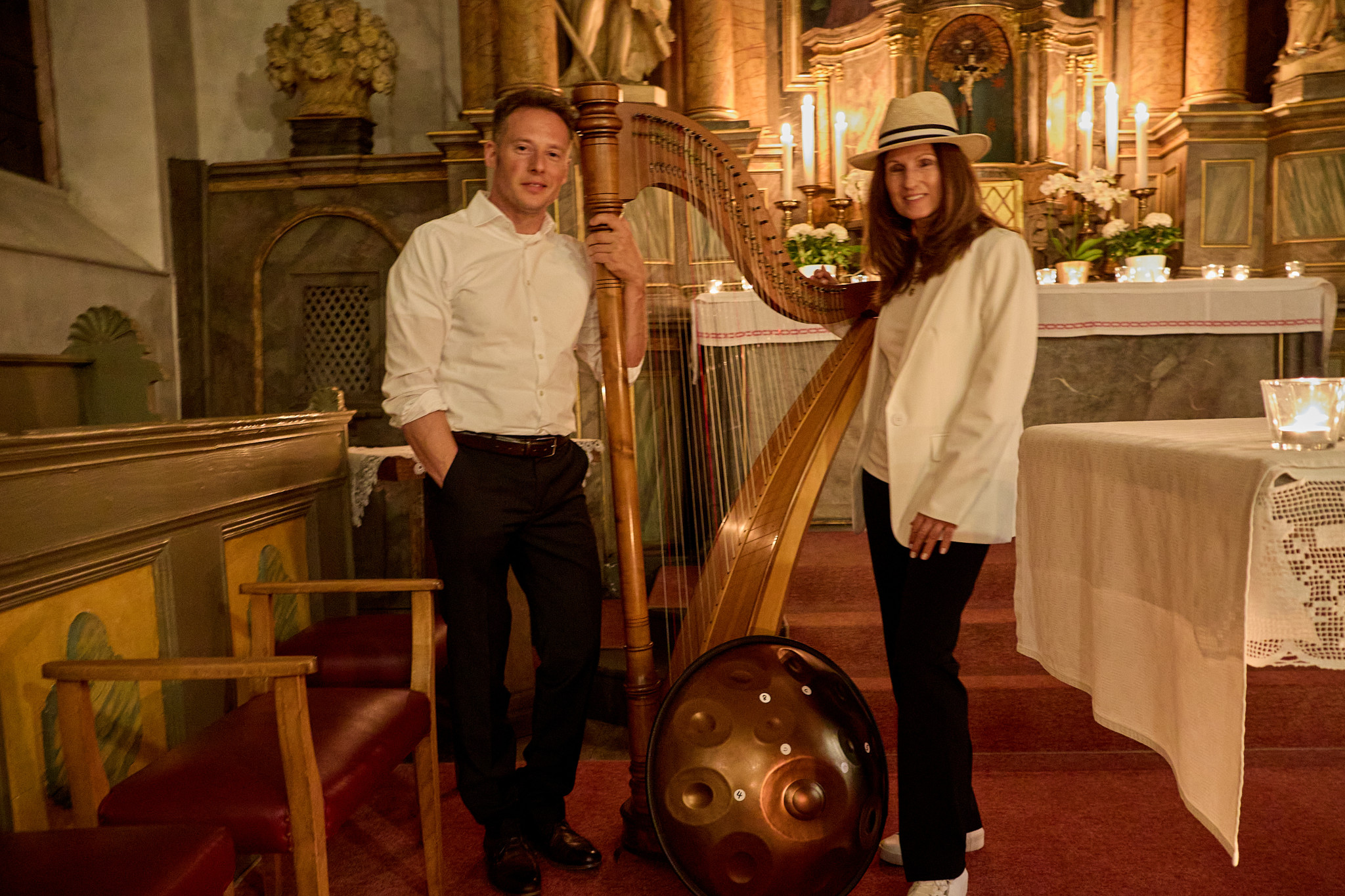 80 Teelichter und viele Kerzen tauchten den Kirchenraum in eine ansprechende Atmosphäre, der Altar und die Seitenaltäre einmal mehr noch in eine einzigartige Stimmung versetzte. In diese Stimmung hinein ließen das Spiel der Harfe und die meditativen Klänge des Handpan die Zuhörer staunen und genießen.