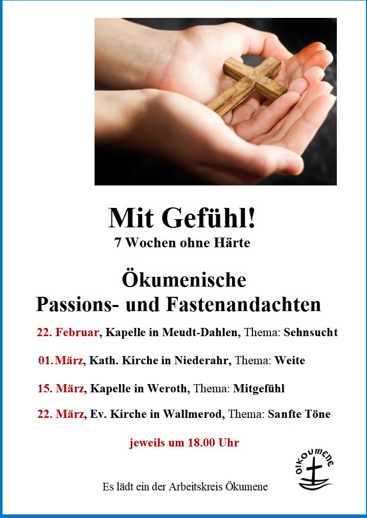 Der Arbeitskreis Ökumene veranstaltet auch in diesem Jahr wieder Ökumenische Passions- und Fastenandachten. Sie finden statt unter dem Motto "Mit Gefühl! 7 Wochen ohne Härte".