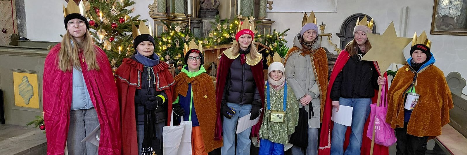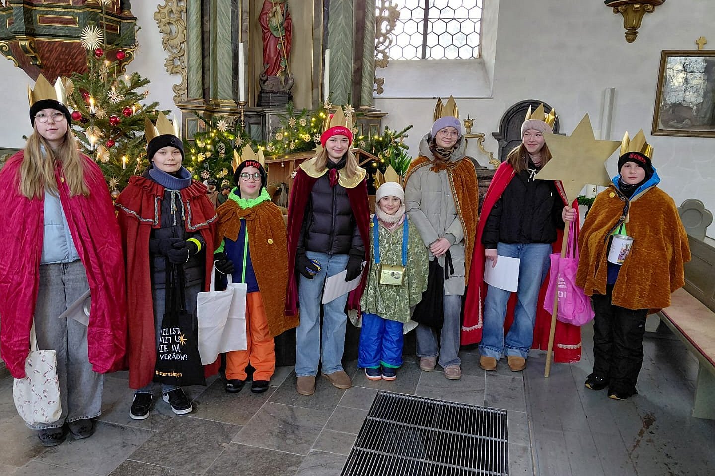 Ausgestattet mit ihrem Stern, den leuchtenden Kronen, den königlichen Gewändern und der Spendenbox, war die Gruppe der Sternsingerinnen und Sternsinger am Samstag, den 03.01.2026 in Hahn am See unterwegs. Traditionell starteten die Kinder an der Krippe in der Kirche St. Margaretha (s. Foto).
